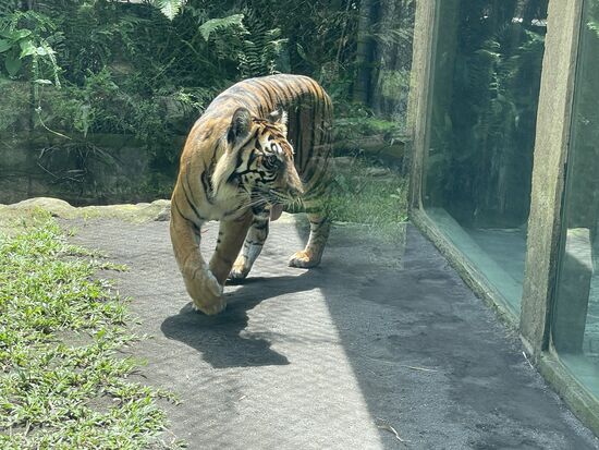 Der Shuttlebus fährt mich zurück zum anderen Teil des Zoos. Es gibt eine Savanne mit Zebras, Vogel Strauss, Pelikanen. In einem grossen begehbaren Gehege sonnen sich ein paar Leguane und die putzigen Lemuren mit ihren gestreiften langen Schwänzen.