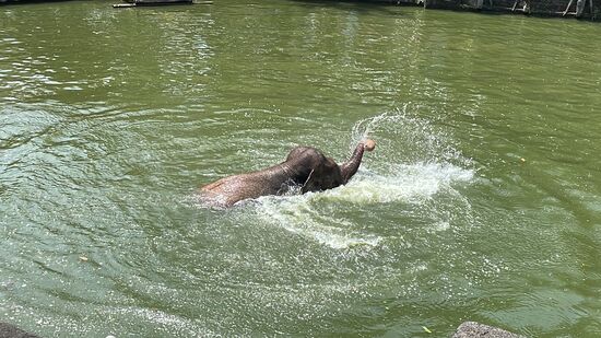 Ich gehe noch einmal zurück zum Elefantenteich und da planscht ein Elefant im Wasser. Ganz ohne Gurtzeug und Sticke ist er im tieferen Wasser, da wo er sogar untertauchen kann. Und das macht er ausgiebig. Wie ein kleiner Junge planscht er, taucht, schwimmt, spritzt um sich und kümmert sich überhaupt nicht um seinen Chef, der ihn vom Ufer her ruft.