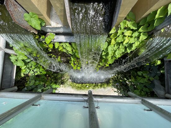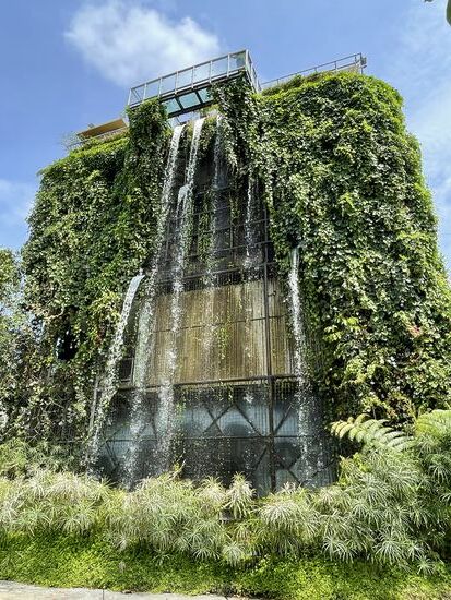 Schade, ich hätte noch länger zugesehen, aber ich fahre jetzt erst einmal mit dem Lift hinauf in den 5. Stock des Aussichtsturmes mit dem Wasserfall. Von hier oben hat man eine gute Übersicht über die ganze Anlage, die mit vielen hohen Bäumen bepfanzt ist. Dahinter liegen Wohnhäuser, das Dorf.