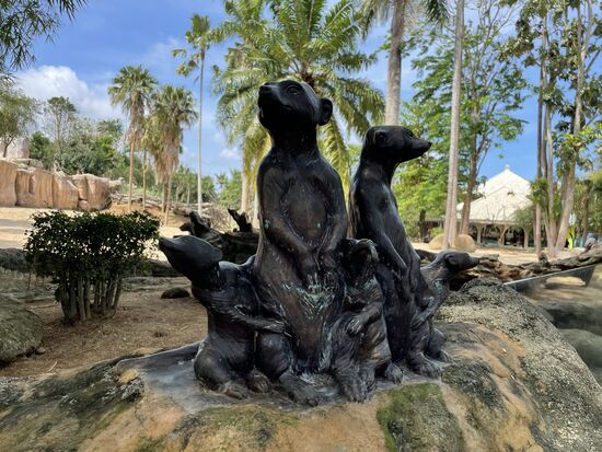 Auch die Erdmännchen sind putzig. Immer wieder hocken sie sich auf die Hinterfüsse und gucken neugierig in die Gegend, um gleich wieder in einem Loch zu verschwinden. Jedenfalls ist die Gruppe aus Bronze einfacher zu fotografieren, als die lebendigen Tiere.
