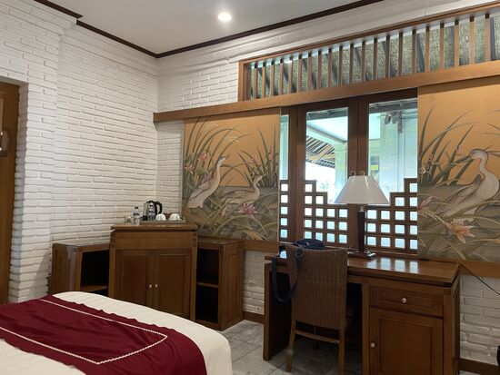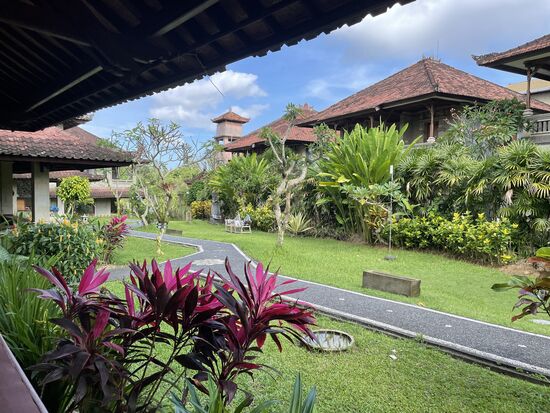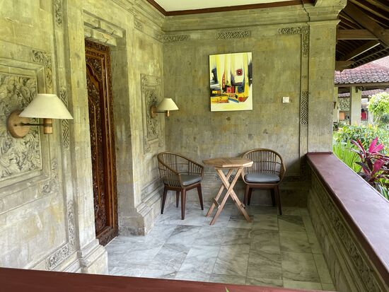 Das Hotel liegt im Zentrum und ich fühle mich auf Anhieb sehr wohl. Die Zimmer sind in typischen Häusern mit je vier Einheiten untergebracht. Jedes Zimmer hat einen Balkon mit einer wunderschön geschnitzten Türe, es gibt einen Schreibtisch, statt Vorhänge gibt es mit Stoff bespannte Bretter. Typisch balinesich.