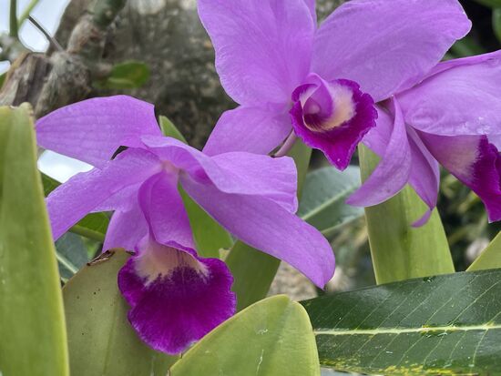Wie immer nach dem Frühstück schlendere ich durch den Garten. Suche neue Fotosujets, Blumen, die neu erblüht sind, Details, die ich bisher übersehen habe. Die Erde ist dabei, den Regen der letzten Nacht aufzunehmen, der Himmel ist wolkenverhangen. Trotzdem hat sich die violette Orchidee jetzt komplett geöffnet. Gestern war sie noch eine Knospe, jetzt erstrahlt sie, zwar noch mit ein paar Wassertropfen auf den Blättern.
