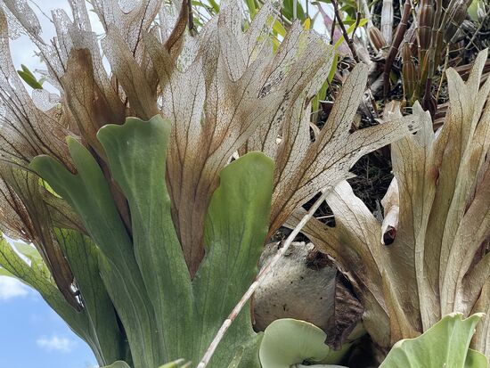 Mich faszinieren die Geweihfarne, die es auch in diesem Garten überall gibt. Die grossen Farnwedel wachsen aus festeren Deckblättern, aus denen wieder andere Farne wachsen, die später als filigrane Blattgerippe um den Gast-Baum ranken.