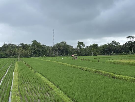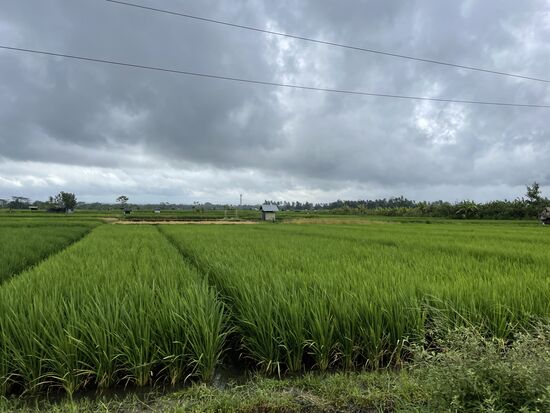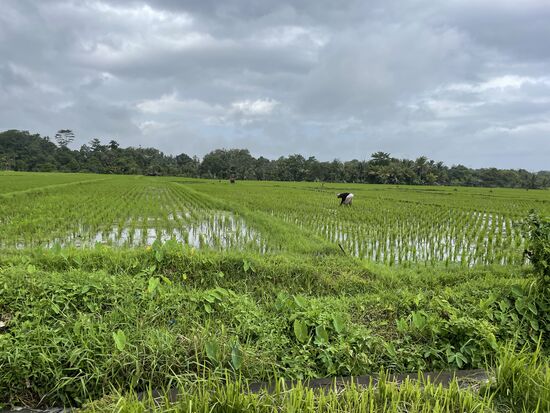Wir verabschieden uns von den Farmersleuten und fahren durch weite Reisfelder, in denen das Wasser steht, so dass man genau die sehr präzise angeordneten Reishalme sieht. Sie wurden alle von Hand eingepflanzt. Auch das eine ungeheure Arbeit, wenn man all die vielen Reisfelder der Insel sieht.