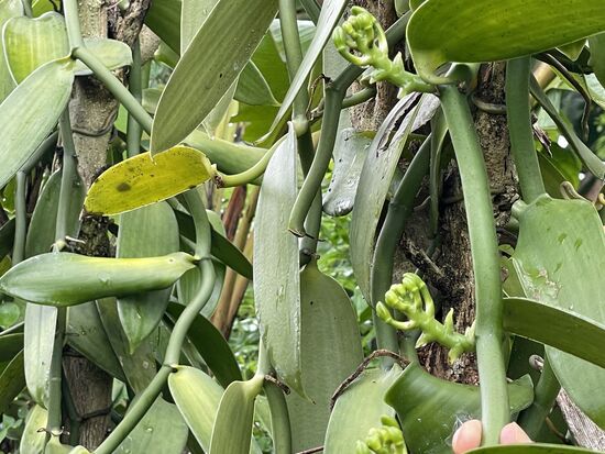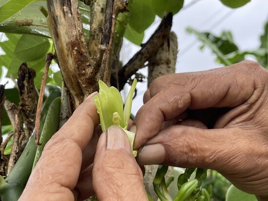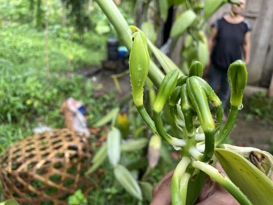 Adi zeigt mir, wie er sie bestäubt. Mit einem Zahnstocher schlitzt er das Kelchblatt auf, drückt den Pollen aus der dünnen Scheide und presst ihn mit dem Daumen auf den Stempel. Warum tut er das? Warum machen das nicht die Insekten? Er scheint es nicht zu wissen, aber er erklärt, dass das mit jeder einzelnen Blüte gemacht wird. Kurz nachdem sie erblüht ist. Und dann fragt er, ob ich Lust hätte, heute Nachmittag eine Vanille-Pflanzung zu besuchen. Er würde zu einem kurzen Besuch hinfahren.