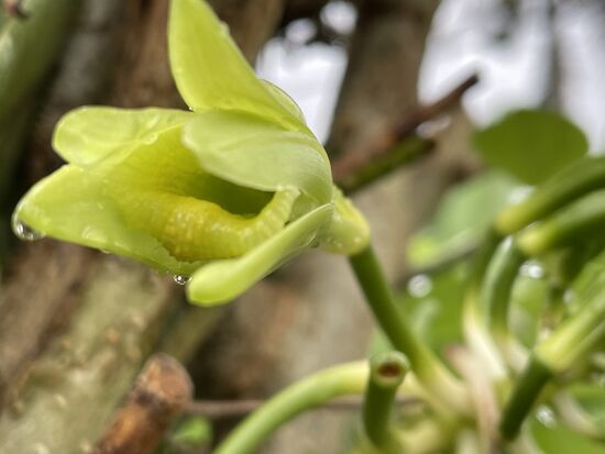 Hast du die Vanille auch gesehen, fragt er mich und macht mich auf eine unscheinbare Blüte aufmerksam. Es ist eine lange Ranke, die sich an einem Pfosten empor windet. Die Blüte ist ganz unten und ich habe sie übersehen, obwohl ich grad bei den orchideenartigen Ranken immer versuche, die ganze Pflanze abzusuchen.