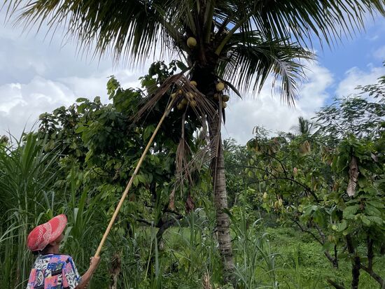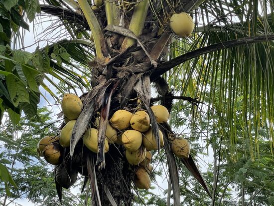 Bevor wir losfahren sehe ich noch kurz der Nachbarin zu, die die Palme von vertrockneten Blättern befreit. Dafür hat sie eine lange Stange mit einem Haken am Ende. Damit reisst sie die Blätter weg, damit die Kokosnüsse mehr Sonne bekommen.