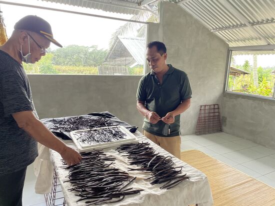 Diese werden nach der Reife vom Farmer geerntet und an Adi geliefert, der den weiteren Prozess und die Vermarktung übernimmt. Deshalb besucht er seine Lieferanten regelmässig. Um sich nach dem Stand der Ernte zu erkundigen und bei allfälligen Problemen Hand zu bieten. "Wir sind die führenden Produzenten von Vanille in Bali, gegen 700 Farmer arbeiten für uns", erklärt er stolz. Allerdings sind die Farmer selbständig, verkaufen an Adi und brauchen sich nicht um die Vermarktung zu kümmern.