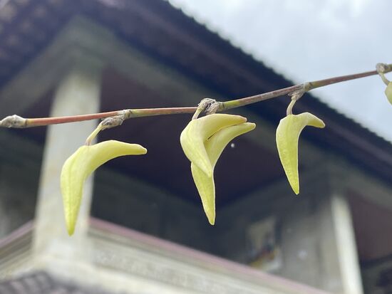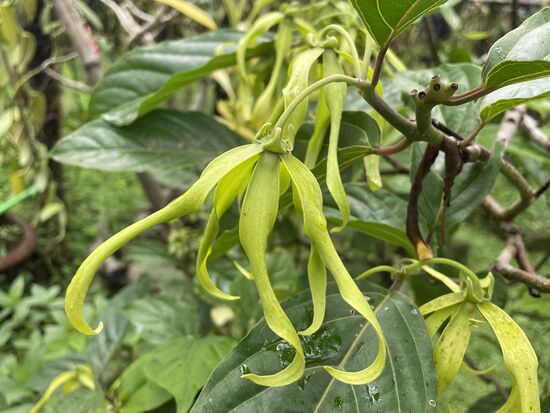 Ob das Blumen sind? diese gewundenen gelben Deckblätter, die sich um einen kleinen Griffel winden. Es ist eine Ylang Ylang-Pflanze. Daraus wird das duftende Oel gemacht. Den Duft kann ich an der Blüte leider nur ganz schwach erkennen, ich nehme an, dass das daran liegt, dass sie noch immer regennass ist, denn vor kurzem hat ein sanfter Regen eingesetzt.