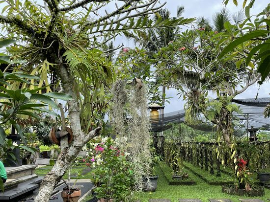 In einem kleinen Dorf halten wir wieder an. Hier, in einem sehr gepflegten Garten mit vielen Orchideen und Geweihfarnen an den Bäumen, mit farbigen Blumen und blühenden Frangipani-Bäumen ist eine weitere kleine Vanillepflanzung.