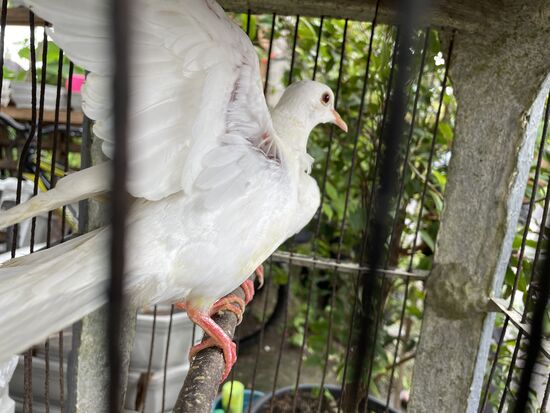 Die beiden weissen Tauben werden wohl als Dekoration gehalten. Sie sitzen ruhig in dem winzigen Käfig.
