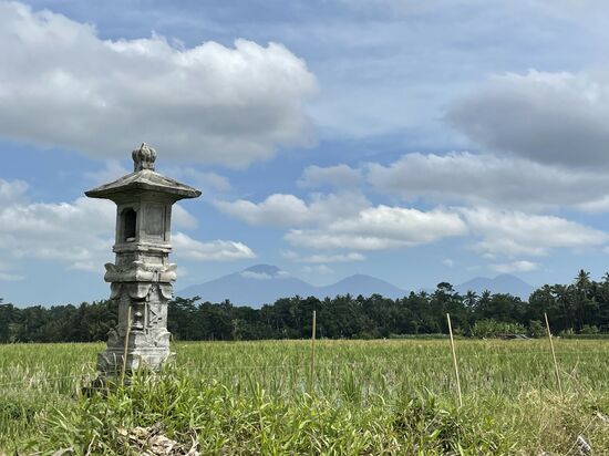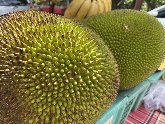 Manchmal werden am Strassenrand Früchte verkauft. Ob das die berüchtigten Durian-Früchte sind? Nachdem wir angehalten haben, muss ich mir erklären lassen, dass es die riesigen Jack-Früchte sind. Eine solche kann bis zu 15 Kilogramm schwer sein. Das ist genau das Gewicht, das mein Koffer für Inlandflüge in Indien haben darf. Man sieht, das Thema beschäftigt mich ständig - auch wenn ich keine Jack-Frucht mitnehmen will. Aber ich darf auch sonst nichts mehr einkaufen, was ich hier in Bali extrem bedaure.