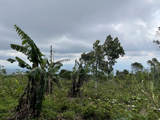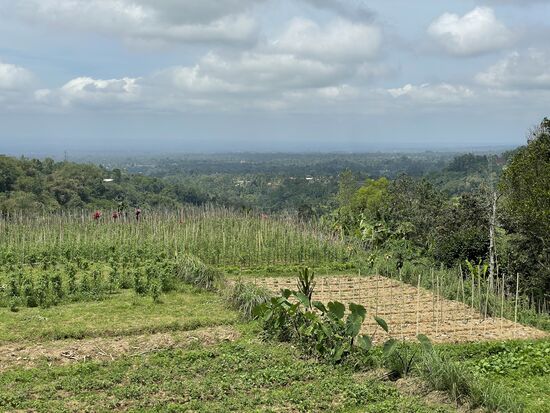 Hinter der Gartenmauer erstreckt sich ein gemischtes Pflanzfeld mit blauen Hortensien und Bananen und ganz vielen anderen Nutzpflanzen.