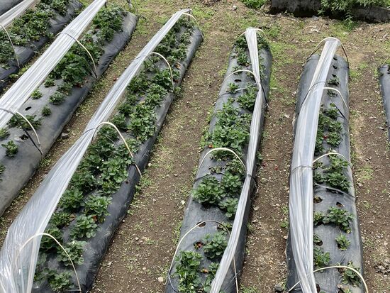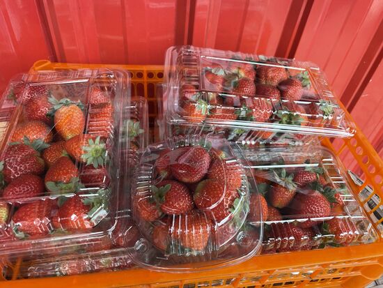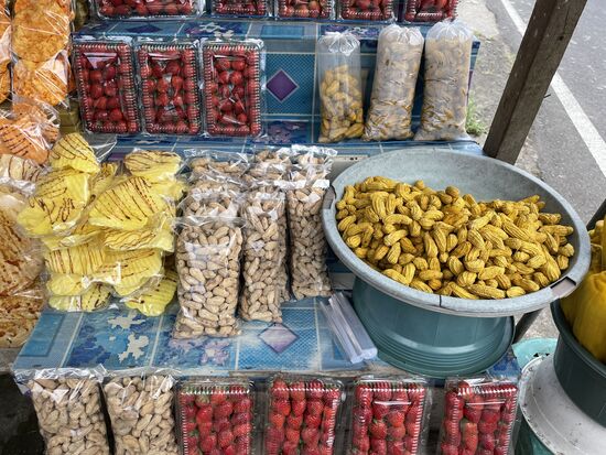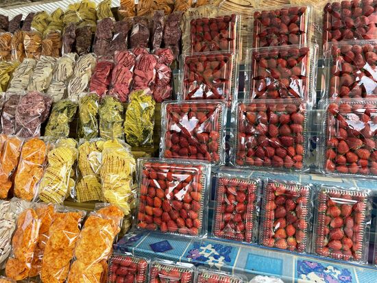 Hier werden überall Erdbeeren angebaut. Auf beiden Seiten der Strasse werden sie an farbenfrohen Ständen zusammen mit grossen bunten Snacks angeboten.