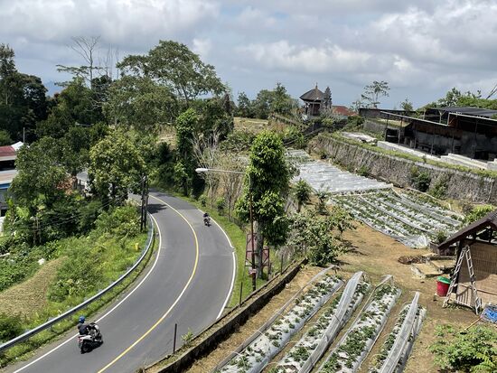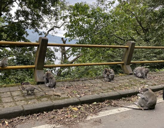 Wir fahren am Vormittag los und kommen wieder einmal durch weite Reisfelder, durch Dörfer und immer wieder durch kleine Wölder. Oft kurble ich das Fenster hinunter, doch als wir draussen ein paar Affen entdecken, schliesst Wayan die Fenster. Ich kann grad noch ein Bild schiessen, dann ist das abgedunkelte Fenster oben. Zu agressiv seien sie, meint Wayan, Wenn man so gemächlich durch die Gegend fahre, könne es sein, dass sie durch die offenen Fenster hinein greifen und blitzschnell etwas mitgehen lassen. Die Brille zum Beispiel. Ich bin alarmiert, wir lassen die Fenster oben, denn den Angriff beim Uluwatu-Tempel vergesse ich nicht zu schnell wieder. Und gemächlich fährt man hier in Bali überall. Sei es wegen den schmalen Strassen, dem Verkehr oder eben einfach aus Gewohnheit. Es gibt auch kaum gerade Strecken, alles ist hier sehr kurvenreich.