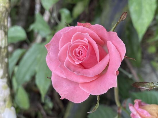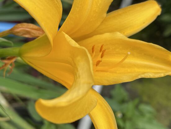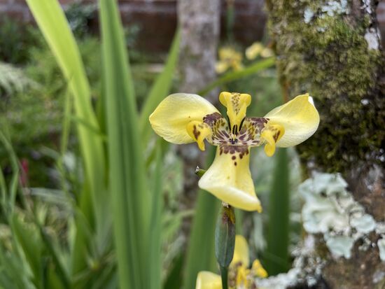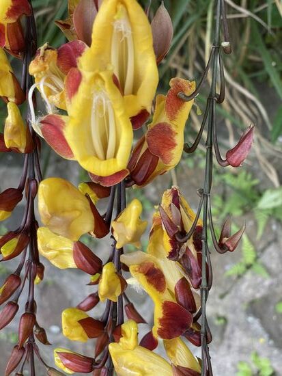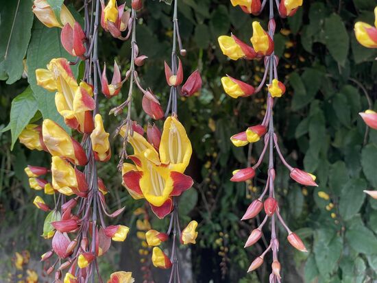 Wir machen in der schattigen Laube erst einmal einen ausgiebigen Halt, so dass ich die wunderbaren Hängeblumen ausgiebig bewundern kann. Thunbergia heisst diese Pflanze und ich kenne sie aus Guatemala, wo sie an vielen Orten wächst. Und wenn ich es mir genau überlege, stimmt es auch mit der Höhe. Die meisten Lagen in Guate sind über 1000 m. Das scheint die ideale Höhenlage für diese wunderschöne Blume zu sein. Es ist hier auch etwas kühler, als unten in der Ebene. Darum finde ich auch ein paar fast verblühte Rosen und eine gelbe Taglilie. Diese blühen in den tieferen Lagen auf Meereshöhre wahrscheinlich weniger gut.