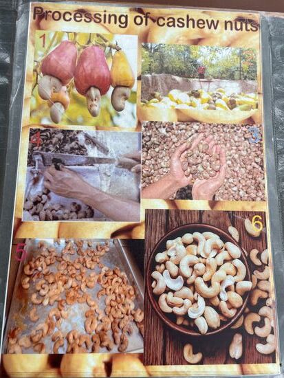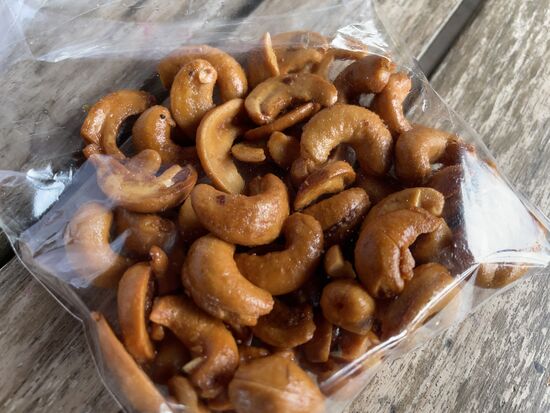 Bei einem Verkäufer kaufe ich ein paar Cashew-Nüsse und er erklärt mir den Prozess, wie die Nüsse produziert werden. Ich kannte die Früchte bereits, aber dass es nicht damit getan ist, die Kerne von den birnenförmigen Früchten zu trennen, sondern dass die Kerne gekocht, die harte Schale entfernt, getrocknet und danach geröstet werden müssen, wusste ich nicht. Vor allem nicht, wieviel Handarbeit dahinter steckt, denn das Knacken und Schälen erfolgt von Hand. Roh sind die Kerne ungeniessbar, ja sogar leicht giftig. Am Schluss können sie süss oder salzig verkauft werden. Er bietet heute Cashew mit Honig an, was ich gleich probieren muss.