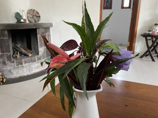 Ich merke sofort, dass ich mich hier wohlfühlen werde. Ich bekomme auf dem kleinen Gelände des Hotels einen Bungalow mit einem grossen Zimmer, das sogar ein Cheminee aufweist. Ausserdem hat es im Bett eine Wolldecke, denn es könne auf dieser Höhe nachts ziemlich kalt werden. So stand es auch im Mail, das ich vom Hotel heute Morgen vor der Abfahrt bekommen hatte. Doch da ich eh nicht so schnell friere, macht mir das keine Sorgen. Ich mache eine erste Fotosafari durch den Garten, entdecke ein paar verblühte Rosen, Bougainvilleas, knallroto Flamingo-Blumen und richte mich in meinem neuen Zuhause ein.