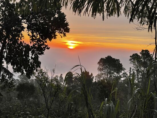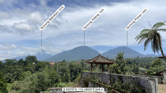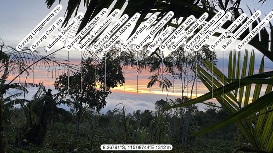 Zum Nachtessen gehe ich ins Restaurant, wo man mir erklärt, dass ich zur Zeit der einzige Gast und nach dem Schliessen des Restaurant um 20.00 Uhr die einzige Person auf dem Gelände sei. Doch ich müsse keine Angst haben, es gäbe einen Wächter, der in der Nacht beim Restaurant sei. Bei einem Problem könne ich ihn jederzeit erreichen. Ich rechne nicht mit Problemen und sehe mir lieber den Sonnenuntergang an. Dabei fällt mir auf, wieviele Berge von hier aus sichtbar sind. Es sind die Berge im Osten, dort wo auch der Vulkan liegt. Leider ist die Sicht schlecht, ich kann nur einzelne Gipfel erkennen, aber meine App weiss natürlich genau, was ich sehen würde, wenn ich es sehen könnte.