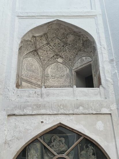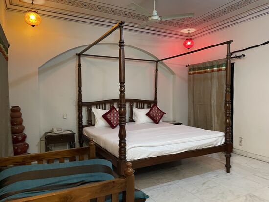 Ahmed hatte mir wieder das Hotel vom letzten Mal vermittelt, das zur gleichen Gruppe wie das vorherige gehört, aber etwas schöner ist, ein Heritage-Hotel - ein Traditions-Hotel. Mit gemalten Bildern an den Wänden, farbigen Lampen im Zimmer, alten Wasserhahnen im Bad, die ich erst in den Griff bekommen muss, denn sie drehen gegenseitig. und am Lavabo sind Kalt- und Warmwasser vertauscht. Zum schweren Zimmerschlüssel gehört ein Schloss, wie zu einem Kerker. Vor allem weil da auch gleich noch zwei Wörter auf beiden Seiten meiner Zimmertüre Wache stehen.