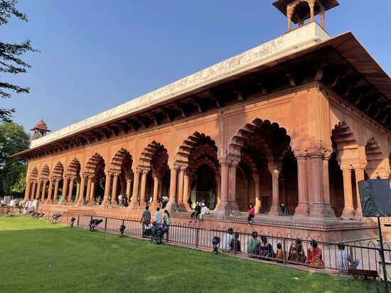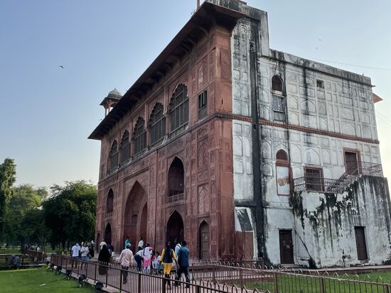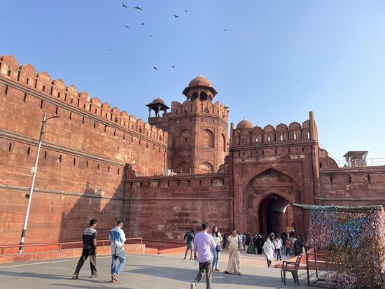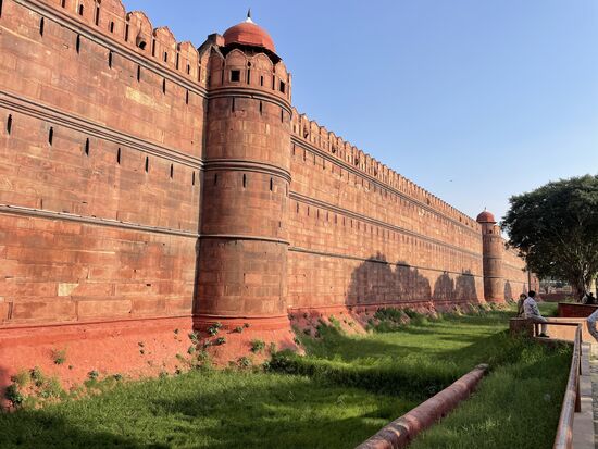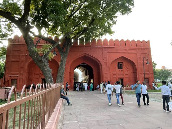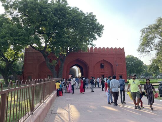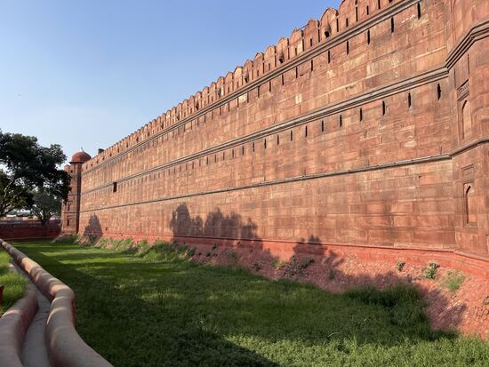 Vom Parkplatz laufe ich erst einmal entlang der langen Umgehungsmauer, die mir einen kleinen Eindruck von der Grösse der Festung vermittelt. Ich mache mir noch keine Vorstellung was mich hinter der Mauer erwarten könnte Red Fort, rotes Fort, wegen der Farbe des Sandsteins, aus dem es gebaut wurde. Und Fort deutet auf Festung hin, also militärisch oder mindestens zur Verteidigung. Erbaut im 17. Jahrhundert von einem der vielen Mogule des Reiches.