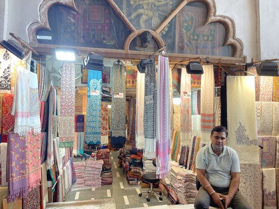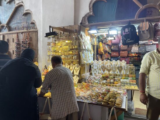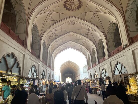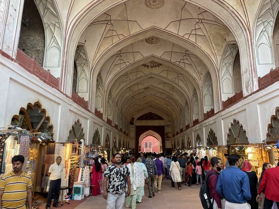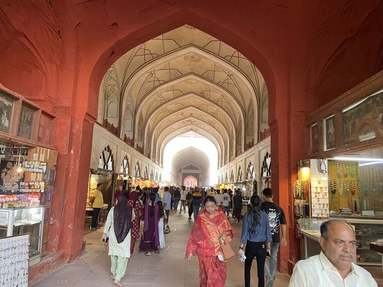 Im langen Durchgang, der mit einer hohen gewölbten Decke und Marmorverkleidungen verziert ist, haben sich ein paar ausgewählte Händler niedergelassen. Vor und in ihren kleinen Läden bieten sie ihre Waren an. Goldene und silberne Schmucksachen, Ringe, Armreife, aufwändige Colliers mit vielen Edelsteinen bestückt. Bunte Saris und wunderschöne glitzernde Saidenschals, Steinarbeiten, Holzarbeiten. Ich lege meinen Sturblick ein, schiele nur kurz auf die Auslagen, mag nicht von jeder Seite angesprochen werden. Mit meinem sturen Geradeausblick und einem freundlichen "No thank you" auf alle Seiten schaffe ich den Spiessrutenlauf und komme auf der anderen Seite wieder an die Sonne.