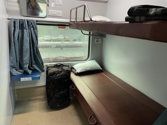 Ich frage noch einen Bahnangestellter. Auch der öffnet seine App und bestätigt, dass ich hier genau richtig stehe. Kurz darauf fährt der Zug ein. Er ist extrem lang, aber der Wagen H1 bleibt tatsächlich diret vor mir stehen. Jetzt noch den Koffer über den steilen Einstieg hieven, dann habe ich es geschafft. Da kommt zum Glück der Bahnangestellte noch einmal vorbei und hilft mir. Alles ok, ich bin im ersten Abteil. Und wenn ich mir bei der 1. Klasse mit Klimaanlage irgend etwas spezielles vorgestellt habe, bin ich jetzt wieder auf dem Boden der Tatsachen angekommen. Ich habe eine Pritsche, keinen Sitz, ein Bahnangestellter bringt kurz darauf zwei saubere Leintücher vorbei, bezieht das Kissen neu, ich bin ausgerüstet, die Fahrt kann losgehen. Bevor wir losfahren kommt noch ein junger Mann, der die Pritsche über mir bezieht, dann fahren wir los. Da das Sitzen unter der oberen Pritsche etwas unbequem ist, lege ich mich tatsächlich hin und lese, während ich durch eine unbekannte Gegend fahre.