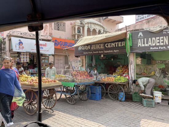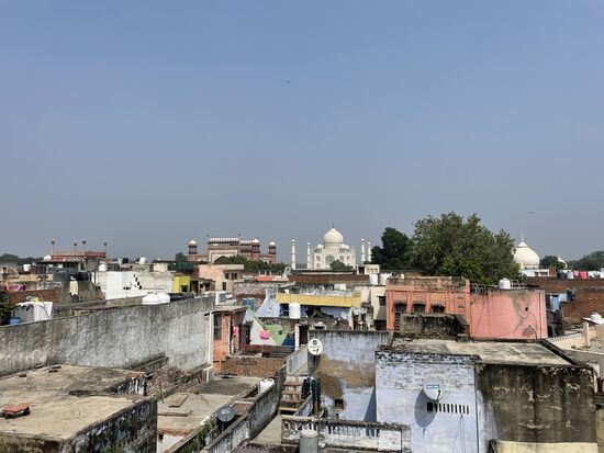 Und dann komme ich tatsächlich um halb zehn in Agra an. Die Frage, wie ich den Koffer aus dem Zug bekomme, klärt sich sofort, denn ich bin kaum von meiner Liege aufgestanden, da steht schon jemand in meinem Abteil, nimmt mir den Koffer aus der Hand und will wissen, in welchem Hotel ich untergebracht bin. Keine Zeit zum Überlegen, keine Zeit zum Verhandeln. Wobei er stellt sich dann draussen nicht als der Taxifahrer heraus, sondern er vermittelt Tuctucs. Und der Preis ist in Ordnung, also bin ich kurz darauf unterwegs zu meiner Unterkunft. Es ist ein Hostel, das in der Nähe zum Taj Mahal liegt, darum gibt es dahin keine Zufahrt für Taxis. Das hatte mir das Hostel noch gestern mitgeteilt, ich solle ab der Station ein Tuctuc nehmen. Der Fahrer weiss Bescheid, es dauert keine halbe Stunde, wir fahren durch alte Quartiere, über Schlaglochstrassen und stehen schon bald vor dem Hostel Joey's. Es ist eine einfache Unterkunft, gebucht habe ich sie, weil sie von der Terrasse einen dirketen Blick zum Taj Mahal verspricht. Ob das wohl stimmt?