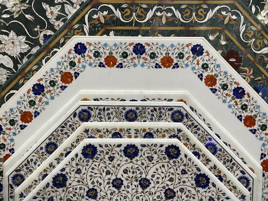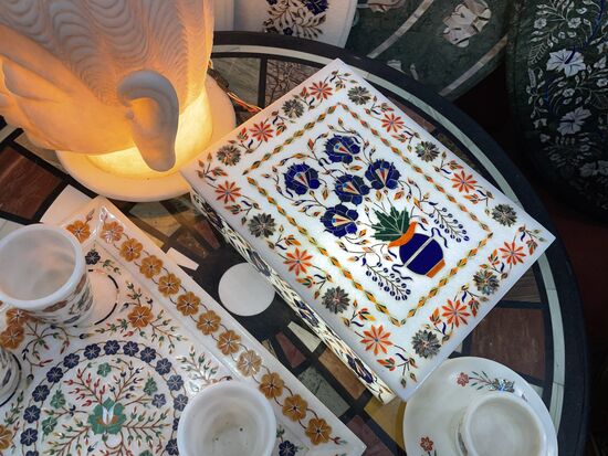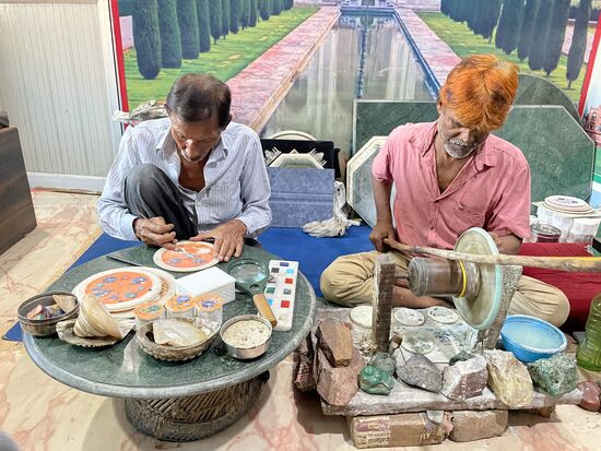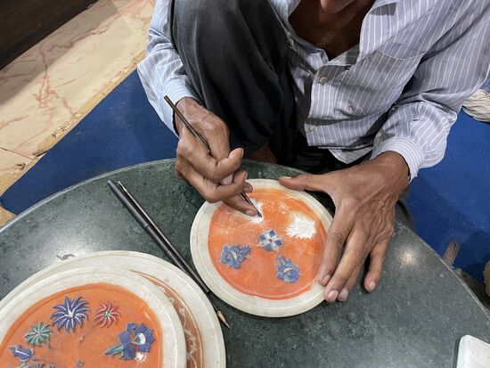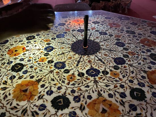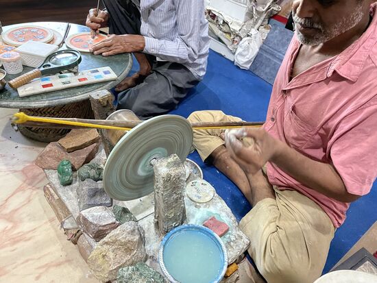 Zu spät habe ich gemerkt, worum es geht. Der sehr nette und kompetente Angestellte des Geschäftes erklärt mir erst die Produktion der aufwändigen Intarsien. Es ist die Arbeit, für die Agra bekannt ist und die auch am Taj Mahal an den Wänden angewendet wird. Natürlich ist auch hier wieder alles von Hand gemacht. Aufgrund einer Zeichnung schleift einer der beiden Arbeiter die farbigen Edelsteine auf die richtige Grösse - oder Winzigkit. Der zweite kratzt mit einer Ahle die Aussparungen heraus, so dass die Steine dann hinein passen und mit Leim befestigt werden können. Danach wird das Ganze geschliffen und poliert.