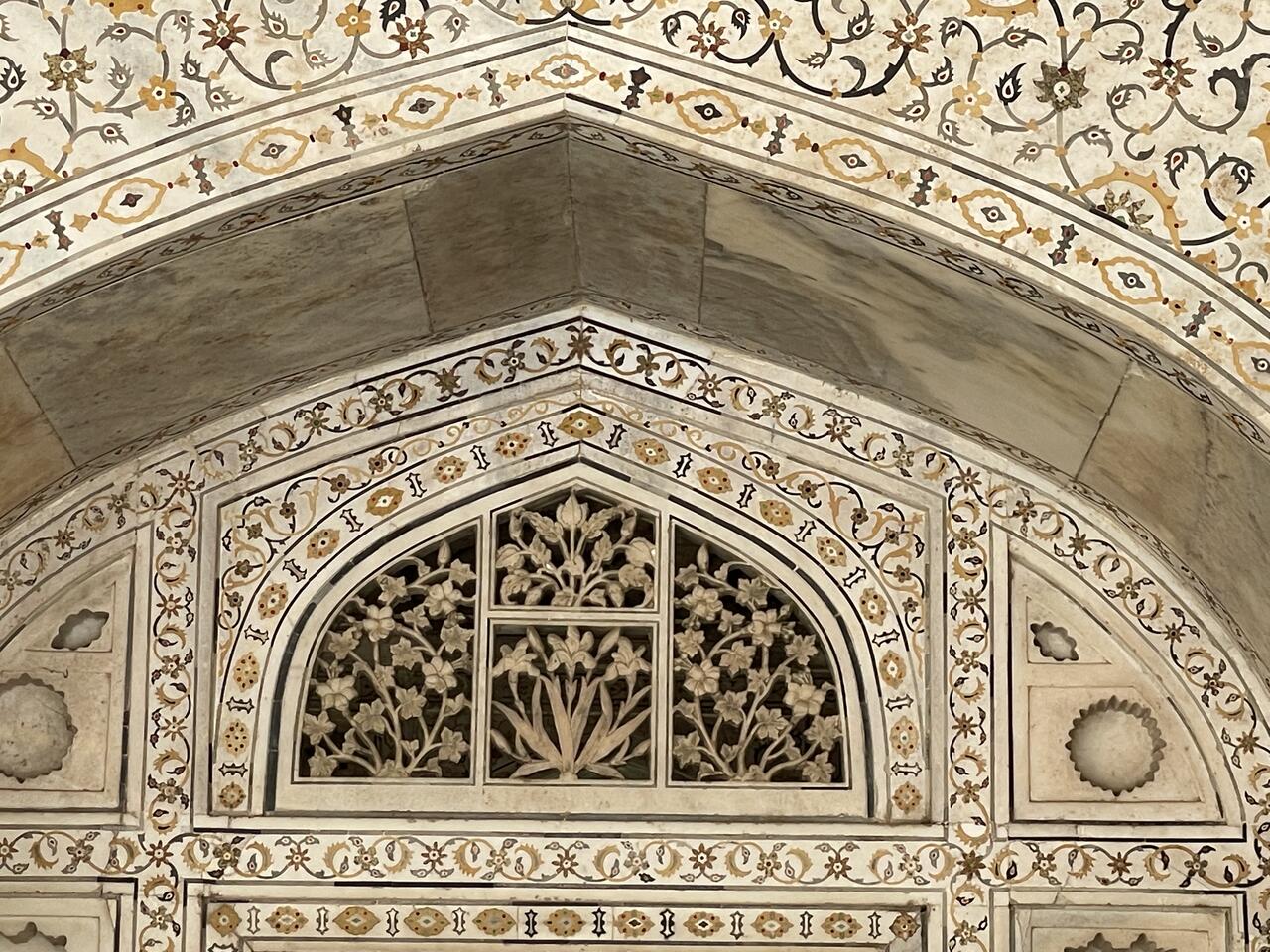 Überall an den Wänden gibt es Ornamente, farbige Steine wurden in Intarsientechnik in die Wände und über Torbogen eingelassen. An anderen Orten sind es Steinmetzarbeiten oder Malereien. Die Techniken sind vielfältig, so wie die Ornamente selber. Sie wiederholen sich nie, sind immer anders und wenn es nur in kleinen Details ist. Manchmal studiere ich einzelne Strukturen. Und auch wenn sie oberflächlich betrachtet identisch sind, so kann man überall kleine Details entdecken, die das eine Bild vom anderen unterscheidet. Man könnte hier gut überall Rätselbilder zum suchen von 10 Unterschieden herstellen. Faszinierend, denn es zieht sich überall durch. Über Fensterbogen, Geländer, Tore, Decken, manchmal weisen auch die Böden Dekorationen auf.