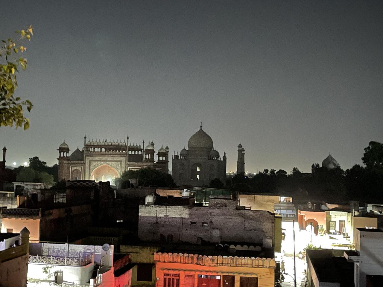 Von einem Fenster im oberen Stockwerk eines Palastes - es gibt mehrere palastähnliche Gebäude, kann ich in der Ferne das Taj Mahal erkennen. In gut 2 km Entfernung liegt es am Fluss und besticht auch von hier durch seine Schönheit und Ästethik. Das war wohl der Blick, der seinem Erbauer in den letzten Lebensjahren noch vergönnt war.