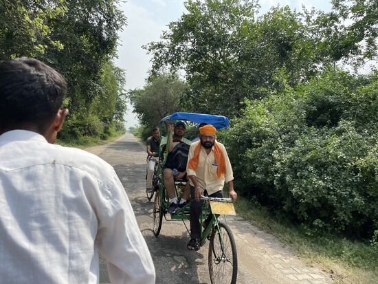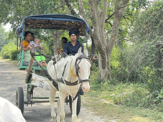 Das gebotene Speedlimit von 20 km/h kann er jedenfalls problemlos einhalten. Und auch die Pferdekutsche, die uns irgendwann entgegenkommt, wird damit keine Probleme haben. Es seien nur zwei Pferde im Einsatz, den Rest bewältigen die Rikschafahrer, erklärt Rakesh.