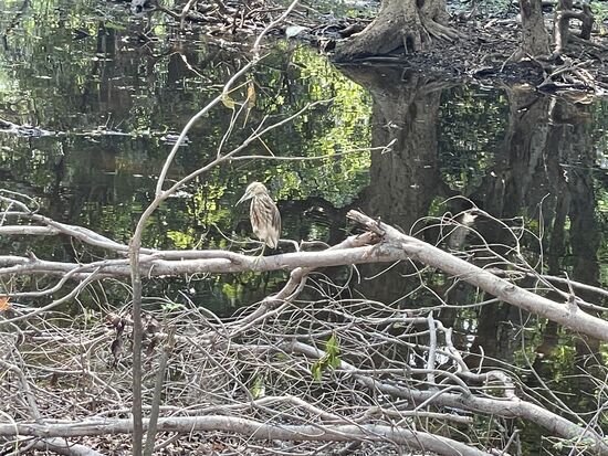 Nur noch versuchen, den Vogel im Dickicht zu fotografieren, dann steigen wir wieder auf. Ich weiss natürlich, dass sich ein Handy für Vogelbeobachtungen nicht wirklich eignet, werde mich eben mit den Fotos von weit entfernten Vogelsiluetten begnügen müssen. Wichtig ist ja eh, dass ich sie überhaupt gesehen habe. Und die Fahrt durch die grüne Natur mit den vielen Wasserstellen tut richtig gut nach all den Strassen udn dem Verkehr in der Stadt.