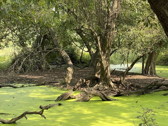 Mir gefallen aber nicht nur die Vögel, die tatsächlich schwierig einzufangen sind, sondern vor allem auch die Landschaft. die grünen Wasserflächen, die fast komplett mit kleinen Wasserpflanzen überwachsen sind, die schwarzen Wasser zwischen abgestorbenen Ästen die irgendwann ins Wasser gefallen sind, die offenen Wasserflächen, in denen sich die Umgebung spiegelt. Nur Ali scheint die Idylle nicht geniessen zu können. Ich merke, wie er weiter drängt. Schade, ich wäre gern auch ein paar Schritte gelaufen, doch das ist nicht vorgesehen.