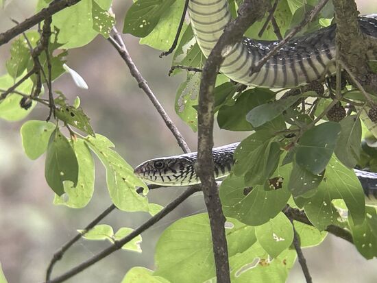 Als wir das nächste mal anhalten, steht da schon eine Rikscha und deren Fahrer macht uns auf eine Wasserschlange aufmerksam. Es dauert eine ganze Weile bis ich sie endlich entdecke. Direkt vor mir in den Zweigen der Böume. Ich hatte beim Begriff Wasserschlange das Wasser abgesucht und jede verdächtige Form als Schlange gesehen.