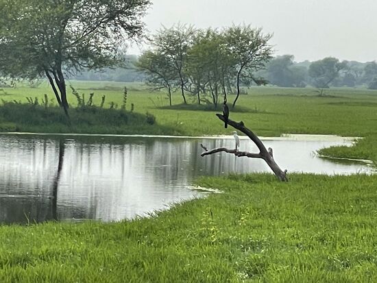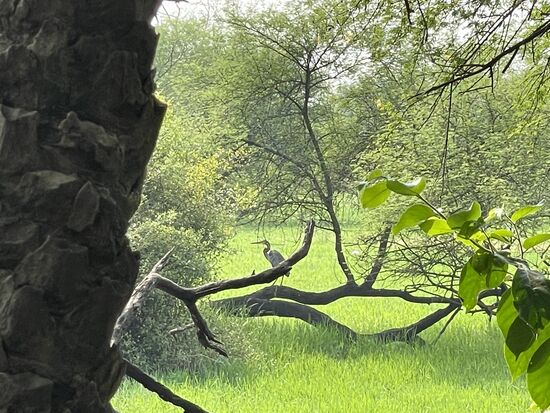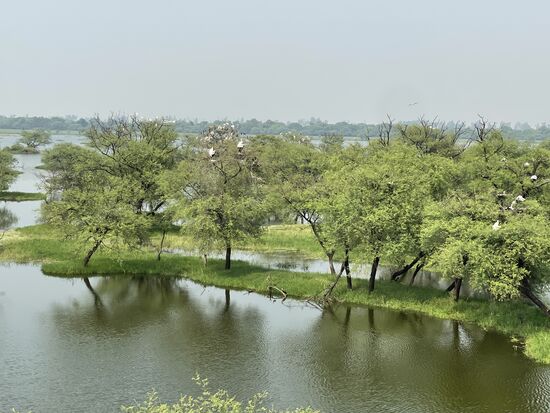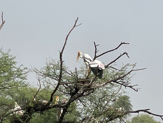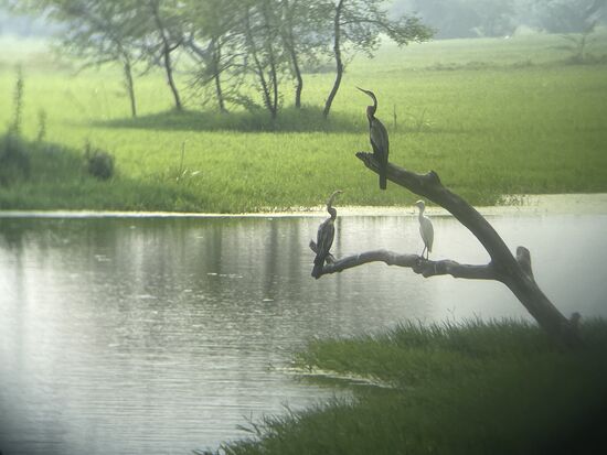 Wir kommen zu einer Stelle, wo auf der anderen Seite der grossen Wasserfläche ganz viele Buntstörche hausen. Sie seien am Brüten, erklärt Rakesh. In ganzen Kolonien leben sie hier in den Bäumen, fliegen auf und suchen Nahrung, kommen zurück, stehen in ihren Nestern. Leider sind sie viel zu weit weg für scharfe Bilder, aber ich finde sie trotzdem spannend. Vor meiner Reise nach Indien hatte ich keine Ahnung, dass sie überhaupt existieren, dann habe ich sie in jedem Zoo angetroffen und jetzt hier in der Freiheit.