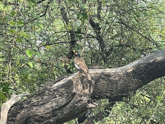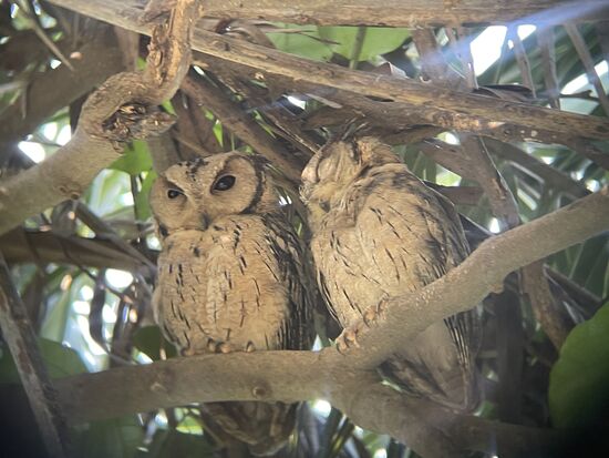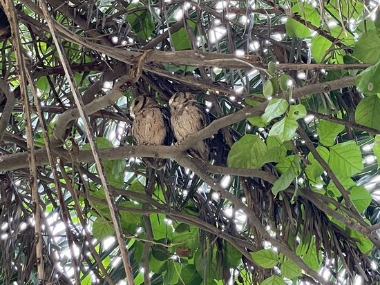 Bevor wir zurück fahren will uns Rakesh noch etws zeigen. In den Ästen eines hohen Baumes hinter der Cafeteria hocken zwei Eulen. Ich nehme an, dass die sich tagsüber immer hier irgendwo aufhalten. Mithilfe des Feldstechers holt er sie näher und macht mir ein paar gute Aufnahmen der beiden grossen Vögel.