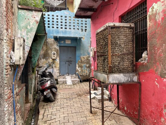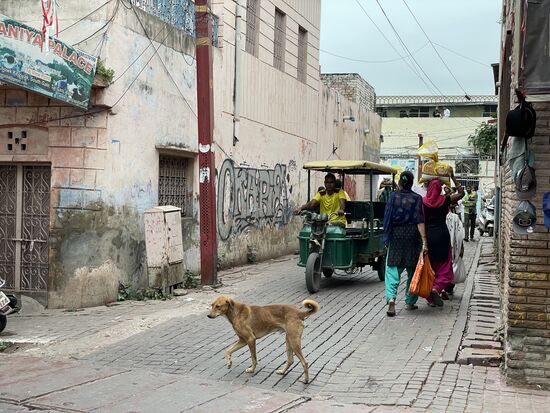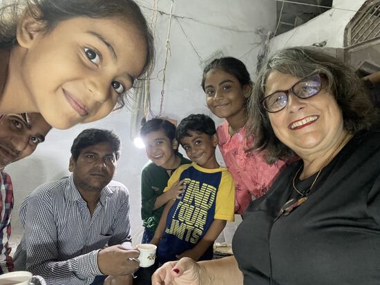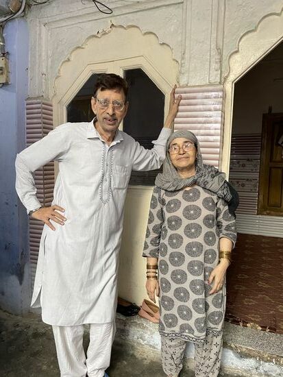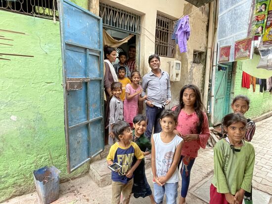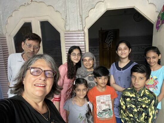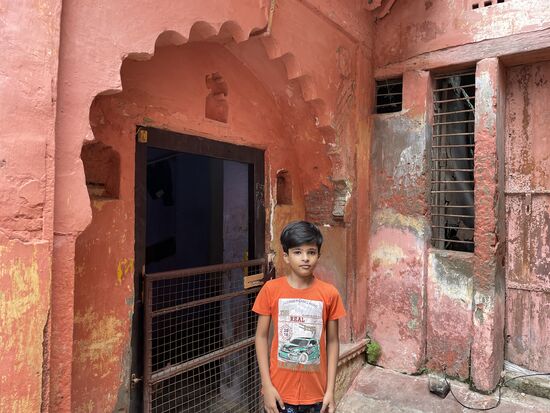 Er zeigt auf die Fenster, die Türe und lädt mich ein, ins Haus zu treten. Ein einfacher Gang, aber aufwändige Verzierungen an den Wänden, über den Fenstern. Die Zimmer scheinen ohne Fenster zur Strasse zu sein, die einzigen Fenster gehen hier in den schmalen Hof. Ein paar Frauen sitzen in einem der Räume, der Mann stellt mir seine Frau vor. Selbstverständlich soll ich sie fotografieren, er freut sich, dass er mir seine Familie vorstellen darf. Auch seine Grosskinder, die wohl zum Teil hier wohnen. Ein junges Mädchen will wissen, woher ich komme. Sie spricht sehr gut Englisch. Es ist die Enkelin, Tochter des Sohnes, der in Delhi lebt. Ihr Vater ist Arzt und auch sie wird Medizin studieren. Und man merkt es gut, ihr Grossvater ist sehr stolz auf sie.