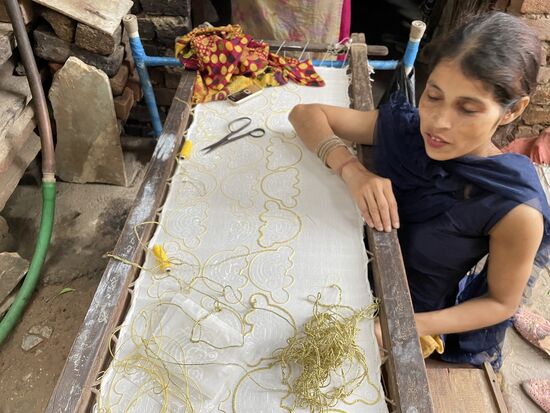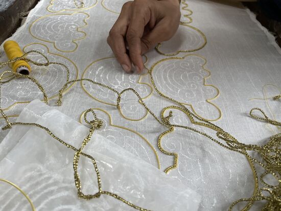 Die nächste Gasse bringt mich zu einer jungen Frau, die am Boden kauert und mit einem Faden goldene Kordeln auf ein aufgespanntes Tuch näht. Es soll eine Tasche werden. Auch hier wieder wird alles in Handarbeit gemacht. Noch kann ich nicht sehen, was daraus wird, aber ich denke, dass es irgendwann auch noch mit Farben verziert wird. Die Zeichnung für die Kordel, die auf dem Stoff fixiert wird, hat die Frau vorher selber aufgemalt. Leider haben wir keine gemeinsame Sprache. Nur ein Lächeln und ein paar Handzeichen müssen helfen. Ich entschuldige mich für die Störung, suche einen weiteren Ausgang, zurück beim Platz.