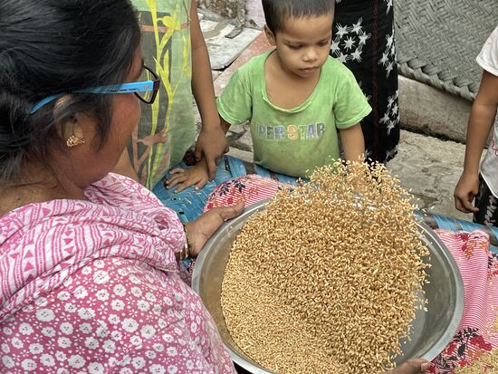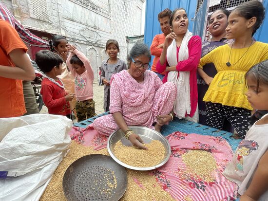 Die nächste Sackgasse ist ein grosser Platz. Hier sitzt eine Frau auf einem aufgespannten Tuch im Lotussitz und wirft Getreide in die Luft. Ich nehme an dass sie dadurch die Spreu vom Getreide trennt. Wenn ich das richtig erkenne, könnte es Hirse sein.