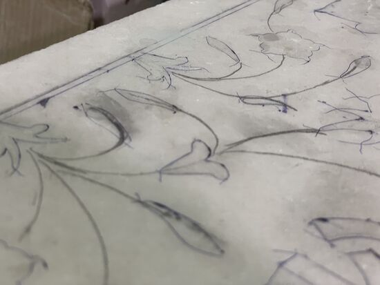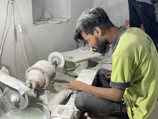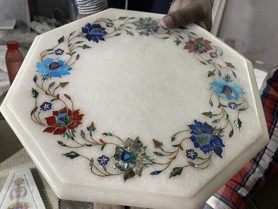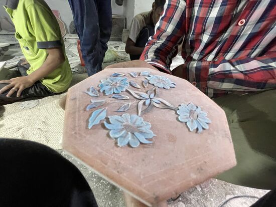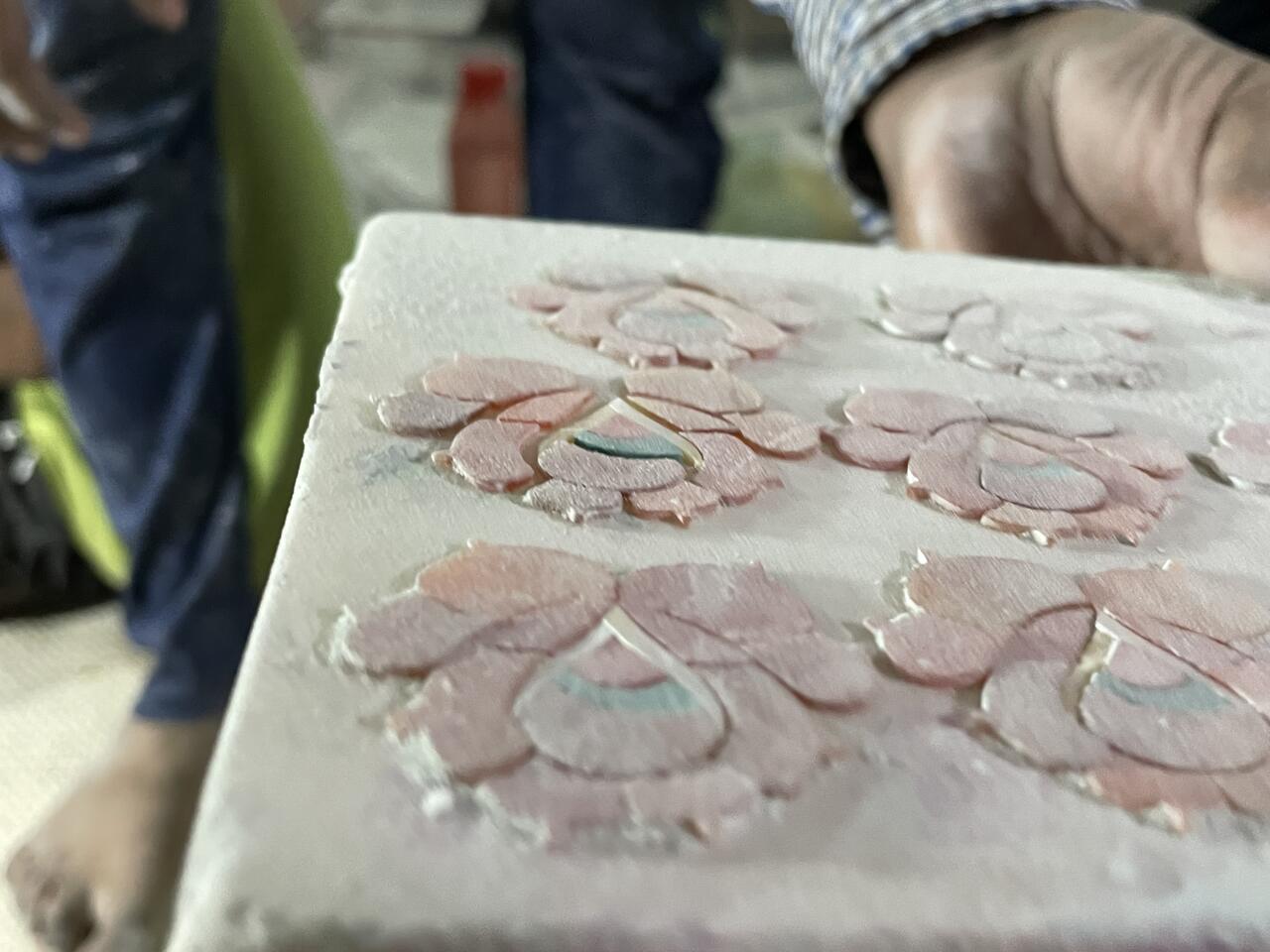 Dann fragt er mich, ob ich interessiert sei, seine Arbeit zu sehen, worauf ich kurz darauf in einer kleinen Werkstatt lande. Zwei Männer sitzen am Boden, einer schleift winzige Steine zu genauen Vorgaben der andere passt sie in ein Stück Marmor ein.
