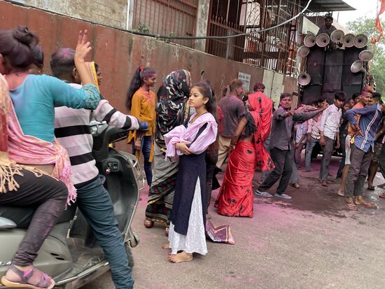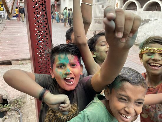 Auf dem Rückweg zum Hostel begegne ich noch einmal einer Gruppe Kinder, die mit Musik und Tanz unterwegs sind. Noch immer gibt es sie, die Gruppen, die ihre Statuen zum Fluss bringen. Diese hier sind ziemlich übermütig unterwegs und so bekomme ich ein paar Spritzer des grünen Pulvers ab. Mein Tshirt weist bereits grüne Flecken auf.