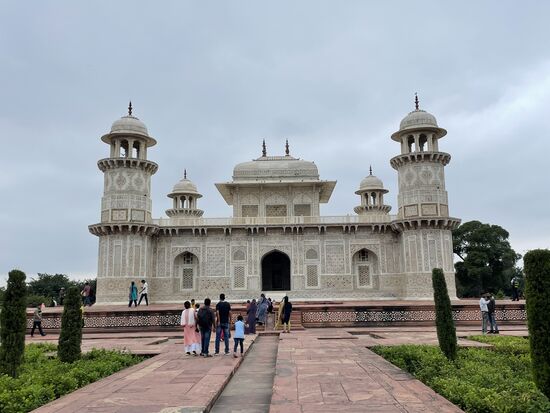 Das Grabmal selber in der Mitte des Komplexes ist im Gegensatz zu dem kurz darauf begonnenen eleganten Taj Mahal etwas plump, hat aber bereits die vier Türme an den Ecken, die quadratische Form und ist ebenfalls reich geschmückt mit den verschiedenesten Arten von Ornamenten. Im Gegensatz vo den vier Toren ist es ganz aus weissem Marmor gebaut, also auch da eine Ähnlichkeit zu dem nur wenig später gebauten Taj Mahal.