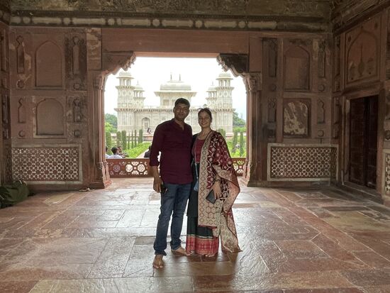 Beim grossen Tor, das zum Fluss führt, treffe ich ein Paar, das in der Wahl ihrer heutigen Kleidung genau die Farbtöne des Gebäudes getroffen haben. Der Sari mit dem aufwändigen Muster harmonisiert perfekt mit den Wänden des Raumes, und das Hemd des Mannes übernimmt den Farbton. Ich frage ob ich ein Foto machen darf und die beiden stellen sich bereitwillig hin. Und erkennen erst jetzt, wie perfekt sie in diese Umgebung passen.