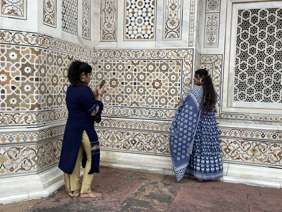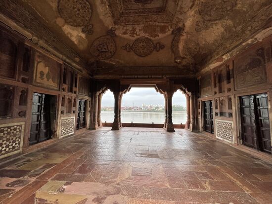 Ich dachte eigentlich nicht, dass mich im Moment noch einmal ein Gebäude so faszinieren könnte, aber dieses kleine Taj Mahal packt mich tatsächlich und ich kann fast nicht mehr aufhören, Fotos zu machen. Vom Ganzen, vom grossen Saal zum Fluss, von Details der Malereien, der Tore. Von den weissen Wänden und den aufwändigen grafischen Elemenen auf den roten Wänden der grossen Tore, die an allen Seiten stehen. Dass man hier barfuss gehen muss, gefällt mir zusätzlich, denn die Platten sind von der Sonne gewärmt und von jeglichen kleinen Steinen befreit.