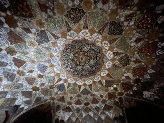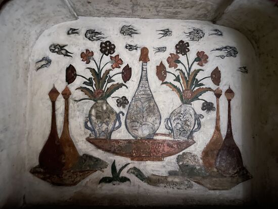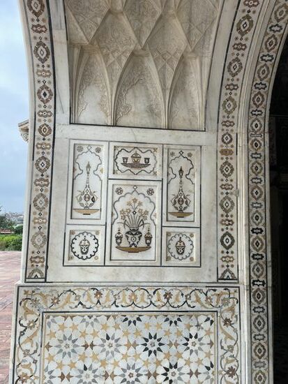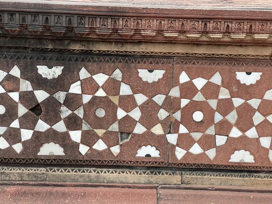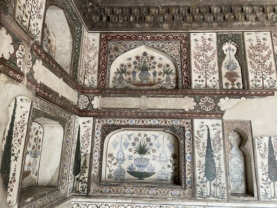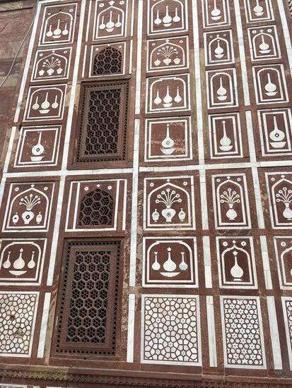 Die Dekorationen an allen Wänden sind allerdings unglaublich detailliert und wunderschön. Aufwändeige Marmorarbeiten aussen, Wandmalereien innen machen das ganze Grabmal zu einem Schmuckstück. Und auch hier wieder zeigt sich die ganze Vielfalt an Ornamenten und Mustern.