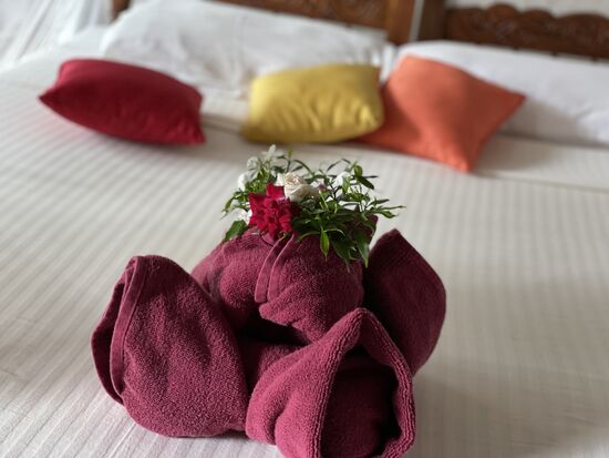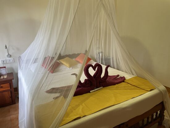 Empfangen wurde ich sehr freundlich von den beiden jungen Frauen der Rezeption. Bevor man mir meine Unterkunft zeigte, musste ich allerdings trotz meinem bereits gemailten Covid-Test noch einen Schnelltest machen. Dann bekam ich ein kleines Häuschen mit breitem Bett und einem Bad mit Dusche. Alles sehr sauber und freundlich. Das Bett wird gemacht, es wird täglich frisches Wasser ins Zimmer gestellt, es gibt einen Wasserkocher, Wöscheservice, einen Safe., einen grossen Ventilator an der Decke. Ich hatte die einfachste Unterkunft gebucht, ohne Klimaanlage, aber es ist Regenzeit, abends kühlt es öfters etwas ab, ich denke, das wird so passen.
