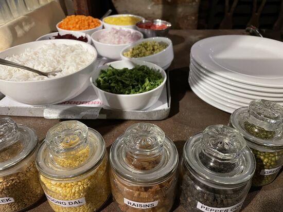 Alles in allem eine äusserst abwechslungsreiche Küche mit vielen verschiedenen Geschmacksrichtungen. Natürlich gehören viele Gemüsecurrys dazu, doch auch hier gibt es verschiedene Abstufungen. Und immer Reis dazu. Auch dieser wird vielfältig variiert. An der Vorführung gab es zum Beispiel Reis mit Randen und Erdnüssen.
