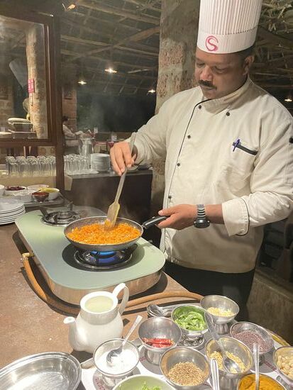 Gestern gab der Küchenchef eine kleine Kochvorführung. Er zeigte drei verschiedene Gerichte. Eigentlich ganz einfach nahzukochen, wenn man alle Zutaten so schön bereit hat. Die ayurvedische Küche ist vegetarisch, bis vegan. Eier gehören jedenfalls nicht dazu und Milch auch nur sehr beschränkt in Form von Yoghurt. Dafür gibt es jede Menge verschiedene Gemüse und Hülsenfrüchte wie Linsen und Kichererbsen. Bohnen, Kartoffeln und Süsskartoffeln, Tomaten, Karotten, Okra - die mag ich besonders - Blumenkohl und andere Kohlarten, Randen (rote Beete), und noch viele andere Gemüse. Als Ergänzung wird auch mit Nüssen, Rosinen, Kokosraspeln, Sprossen oder Datteln gekocht. Dazu kommen frische Früchte wie Mangos, Trauben, Papayas, Granatapfel, Drachenfrucht und viele mehr.