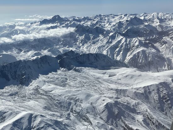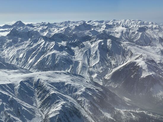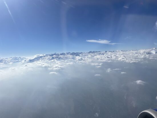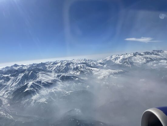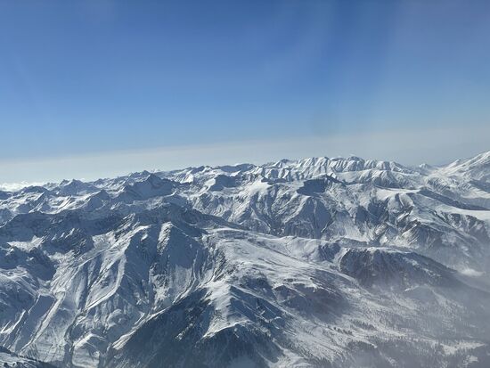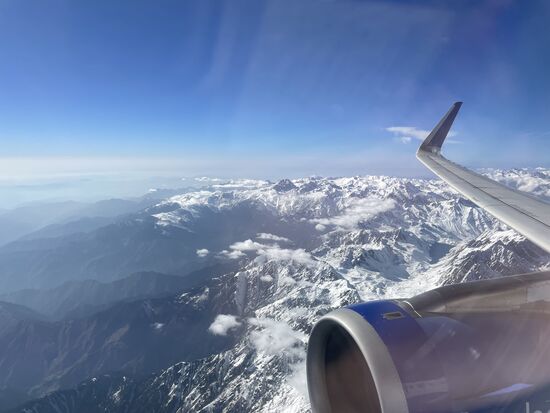 Ich sitze am Fenster, machte meinen beiden Sitznachbarn noch den Vorschlag die Sitze zu tauschen weil ich als letzte zustieg, aber sie lehnten ab. Und jetzt würde ich es bedauern, wenn sie angenommen hätten. Über mir der strahlend blaue Himmel, unter mir die höchsten Berge der Welt. Zwar fliege ich nicht direkt über die höchsten Gipfel, denn die Flugroute führt über den Rand des Himalayas, aber ein paar 4'000-er werden das unten schon sein.
